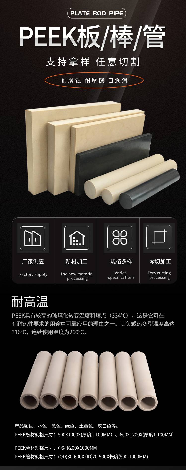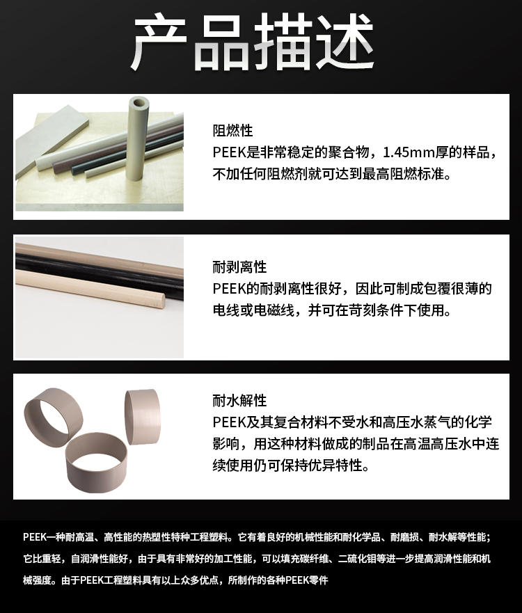 PEEK(聚醚醚酮)是一種耐高溫,高性能的熱塑性特種工程塑料。它有著良好的機械性能和耐化學藥品性、耐磨損、耐水解、比重輕、自潤滑性嫩性能好;由于具有非常好的加工性能,可以填充碳纖維、二硫化鉬等進一步提高潤滑性能喝機械強度。此外,PEEK還有另外三種不同級別材料:PEEK-GF30、PEEK-CA30、PEEK-HPV等材料!